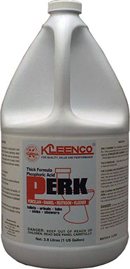 P.E.R.K. is a special cleaner, designed for institutional and industrial cleaning. Cleans porcelain, tile, fixtures, stainless steel and other inanimate hard surfaces. When used as directed. P.E.R.K. will also deodorize those areas which generally are hard to keep fresh smelling. Including garbage pails, sink tops and other bathroom areas which are prone to odors. Removes film, scale and rust deposits. Extra viscous to prolong contact time on vertical surfaces.