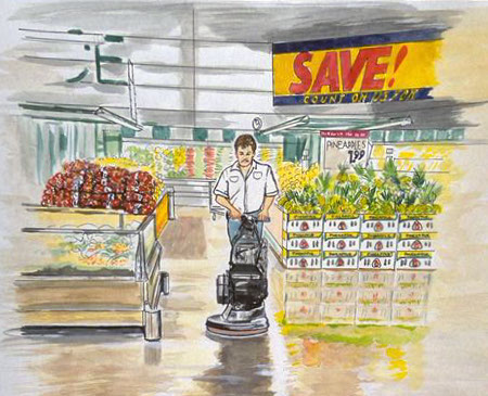 The average person walking on floor can exert as much as 11-1/2 pounds of force per square inch. Doesn't sound like much but multiply that by perhaps hundreds or thousands of shoppers every day and now throw into the mix sand from the parking lot, spills from food and drink, cleaning solutions and numerous other agents that batter a floor finish and last but not least run it over with a machine turning at 2,000 to 3,000 rpm with an aggressive hogs hair pad and you can see that a lot is being asked of such a tiny thing.